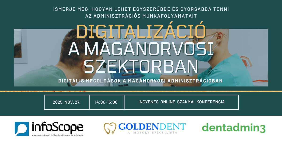 Szeretettel meghívjuk Önt az InfoScope Kft. által szervezett, Digitalizáció a magánorvosi szektorban című online szakmai konferenciánkra, ahol az elektronikus dokumentumkezelés modern megoldásaival ismerkedhet meg, különösen a magánorvosi adminisztráció területén jelentkező kihívások megoldására.